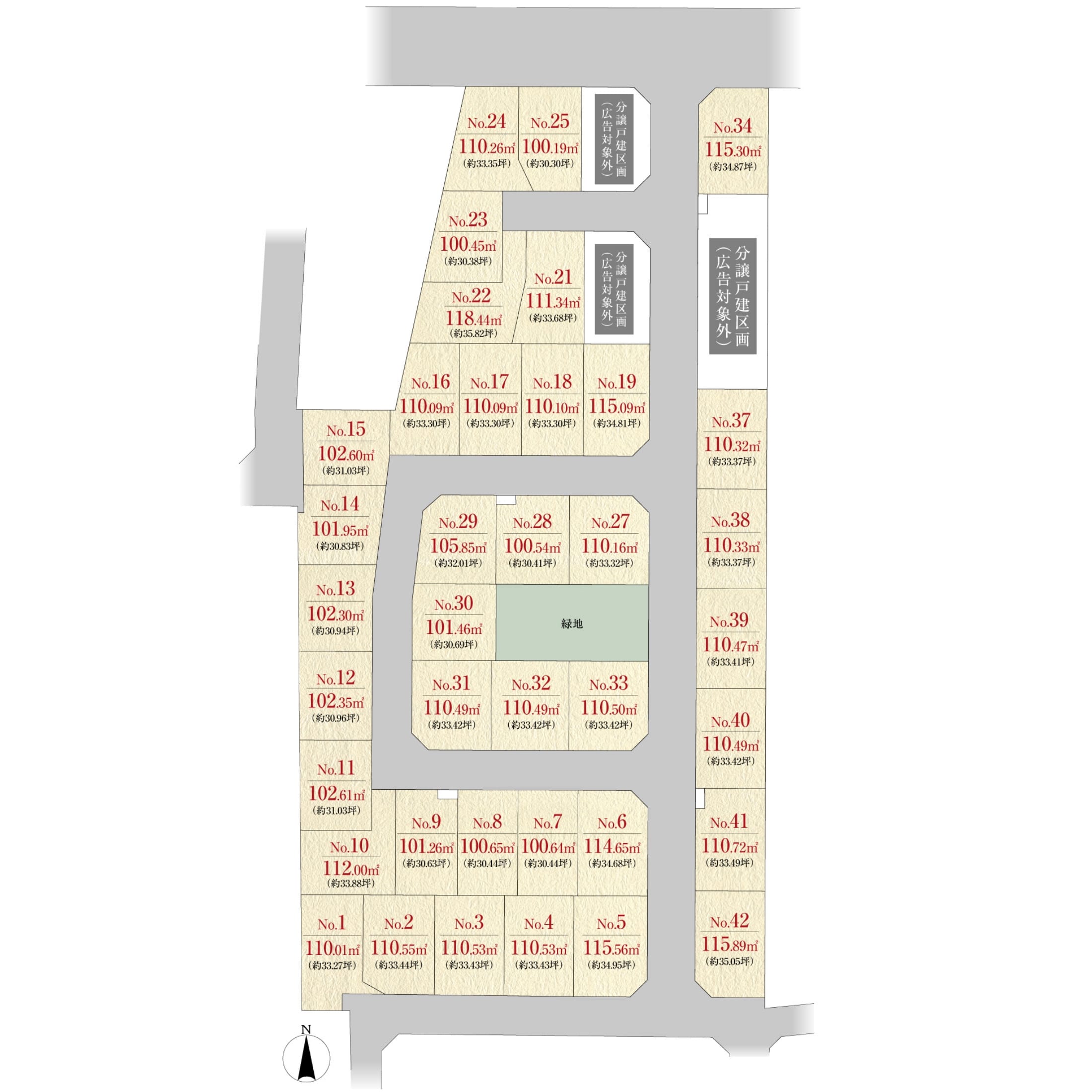 42 ※建築条件付宅地38区画、及び分譲戸建4区画(広告対象外、2025年9月現在 完成予定未定)の総区画数